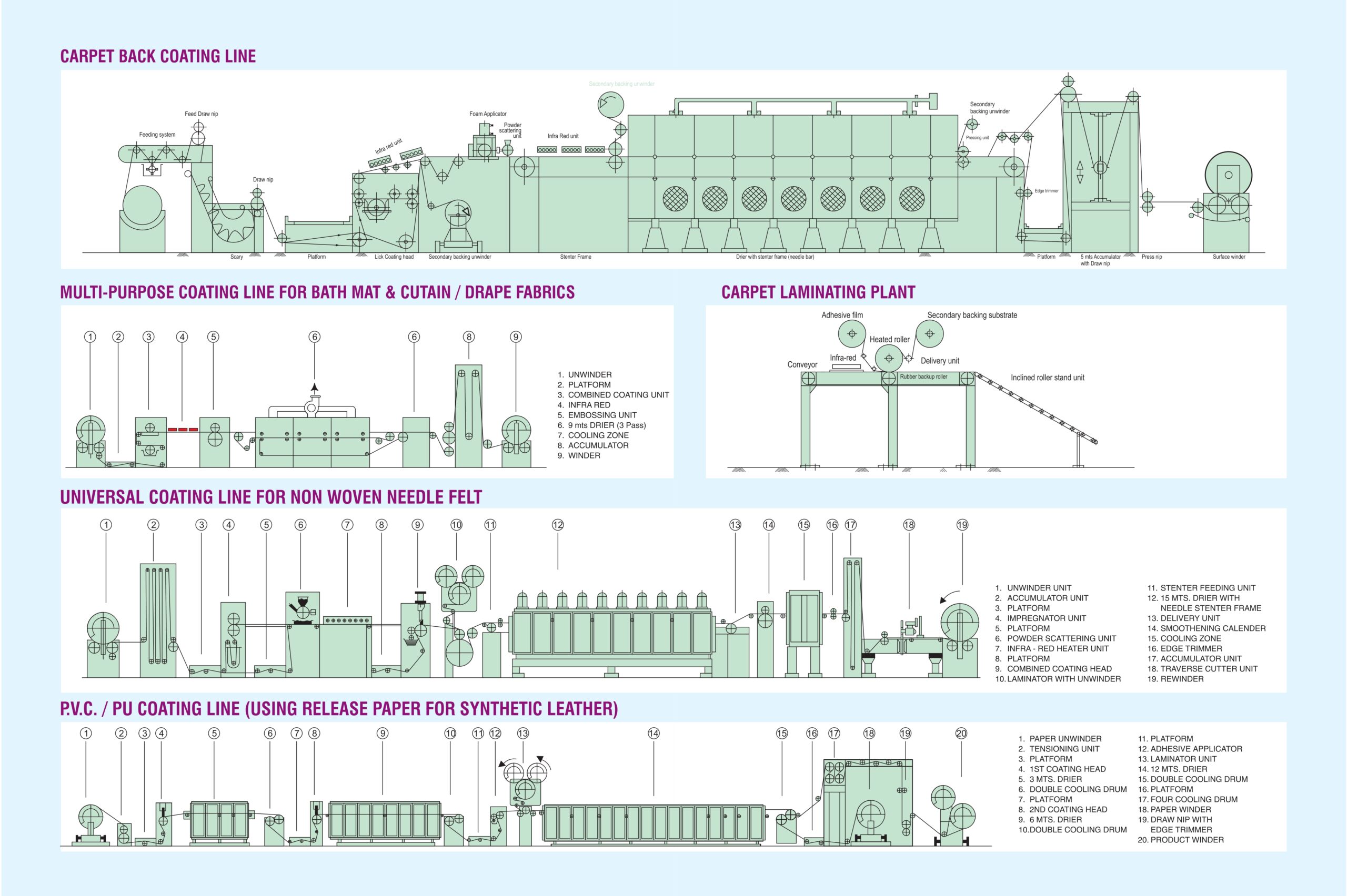 Of Hot Melt Glue Coating Machine, Technical Textile Foam Finish System, Latex Foam Coating Plant, Carpet Back Coating Plant, PVC Coating Plant, Polyurethane Coating Plant, Acrylic Coating Plant, Latex Foam Coating Plant, Textile Dryer Conveyor, PU Coating Plant for Synthetic Leather….